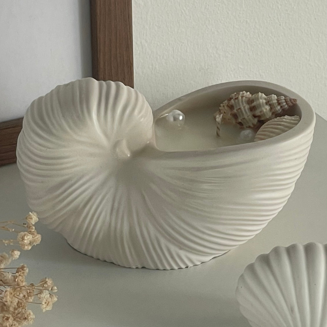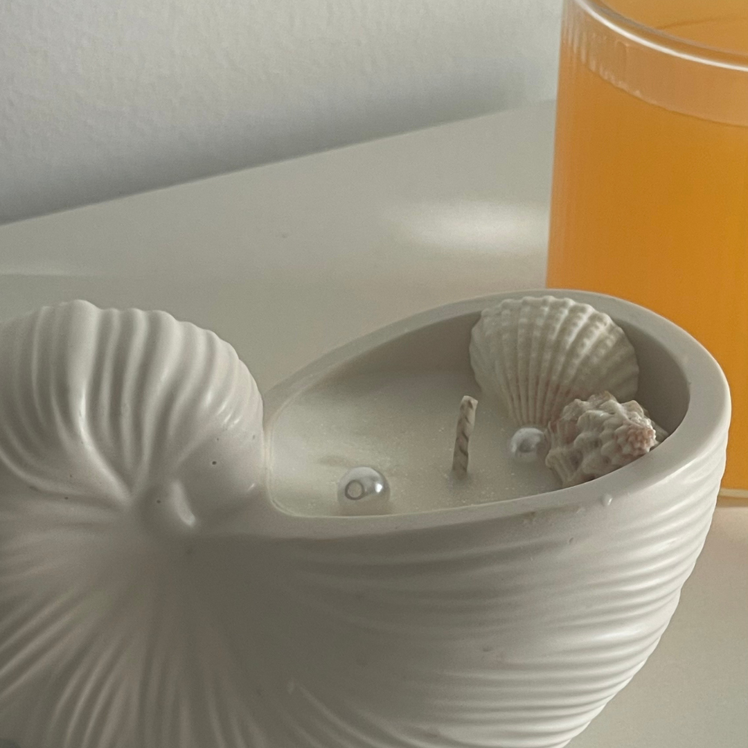 A vela Coastal Curl é uma ode à natureza marítima, com a sua base esculpida em jesmonite em forma de concha espiral — um design elegante, sereno e naturalmente sofisticado. Decorada com conchas e pérolas, esta peça transforma qualquer espaço num refúgio costeiro, com aromas que evocam dias quentes à beira-mar.